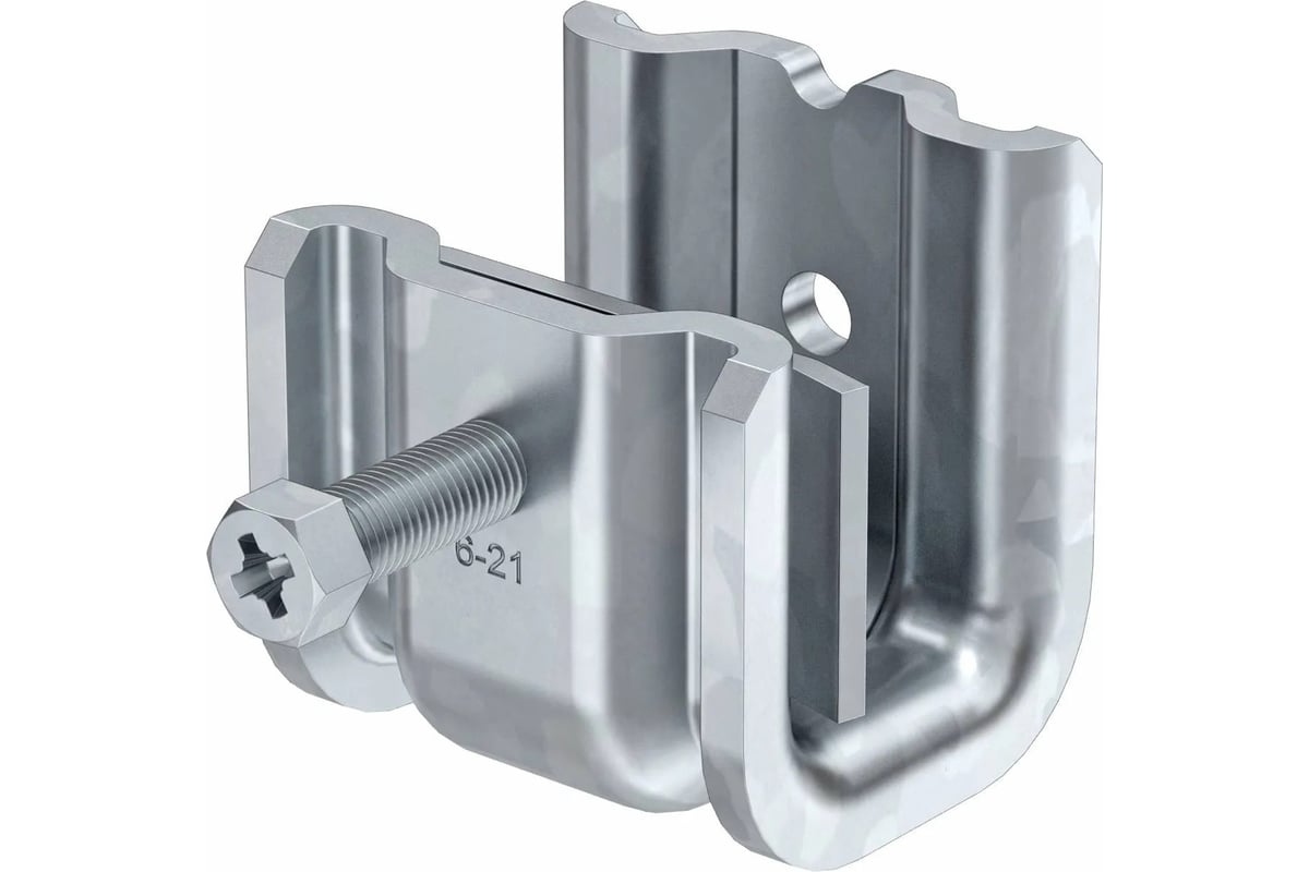 Этот вид балочного зажима устанавливается на опору и фиксируется с помощью прижимной пластины и винта (M8) на опоре или полосовой стали. Болт имеет ширину 10 мм. В корпусе скобы имеется также 2 резьбы M6, например, для крепления стержня с резьбой.