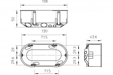 Двойная коробка, для 2 устройств или одного двойного устройства, с 4 винтами. Размеры согласно DIN 49073-1, для пластин толщиной 7 – 35 мм. Стандартное расстояние 71 мм, 14 мембранных отверстий для проводов NYM, линий передачи данных и труб Ø 20 мм, степе