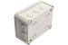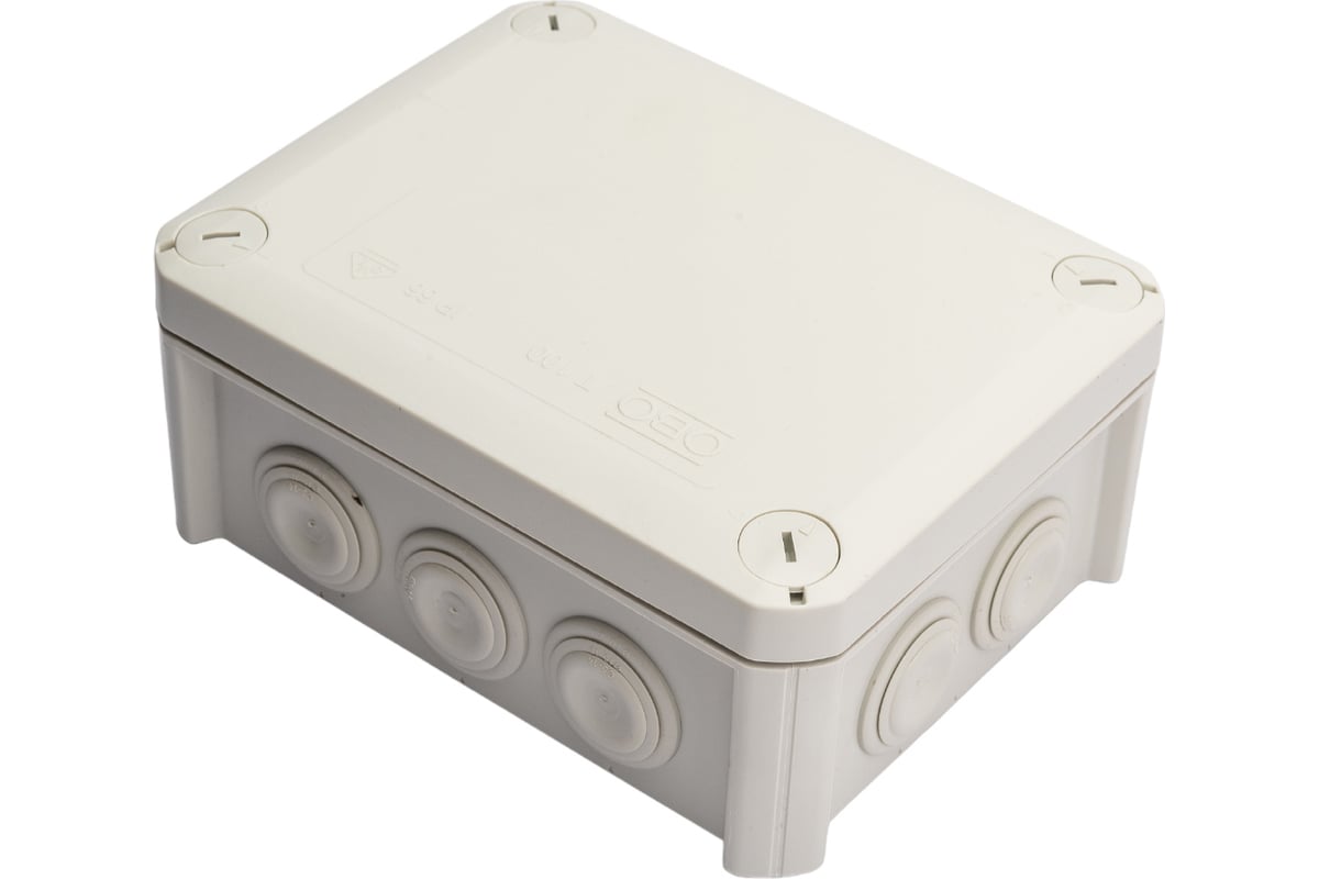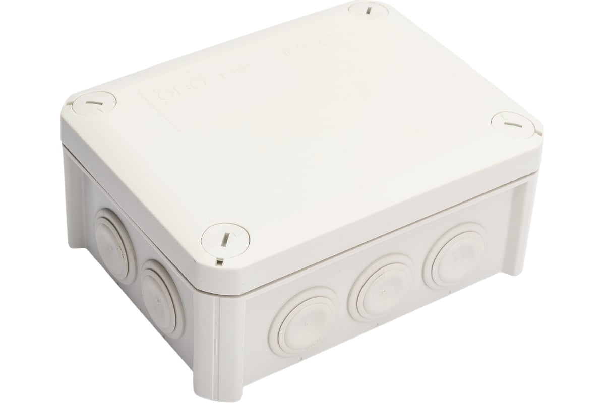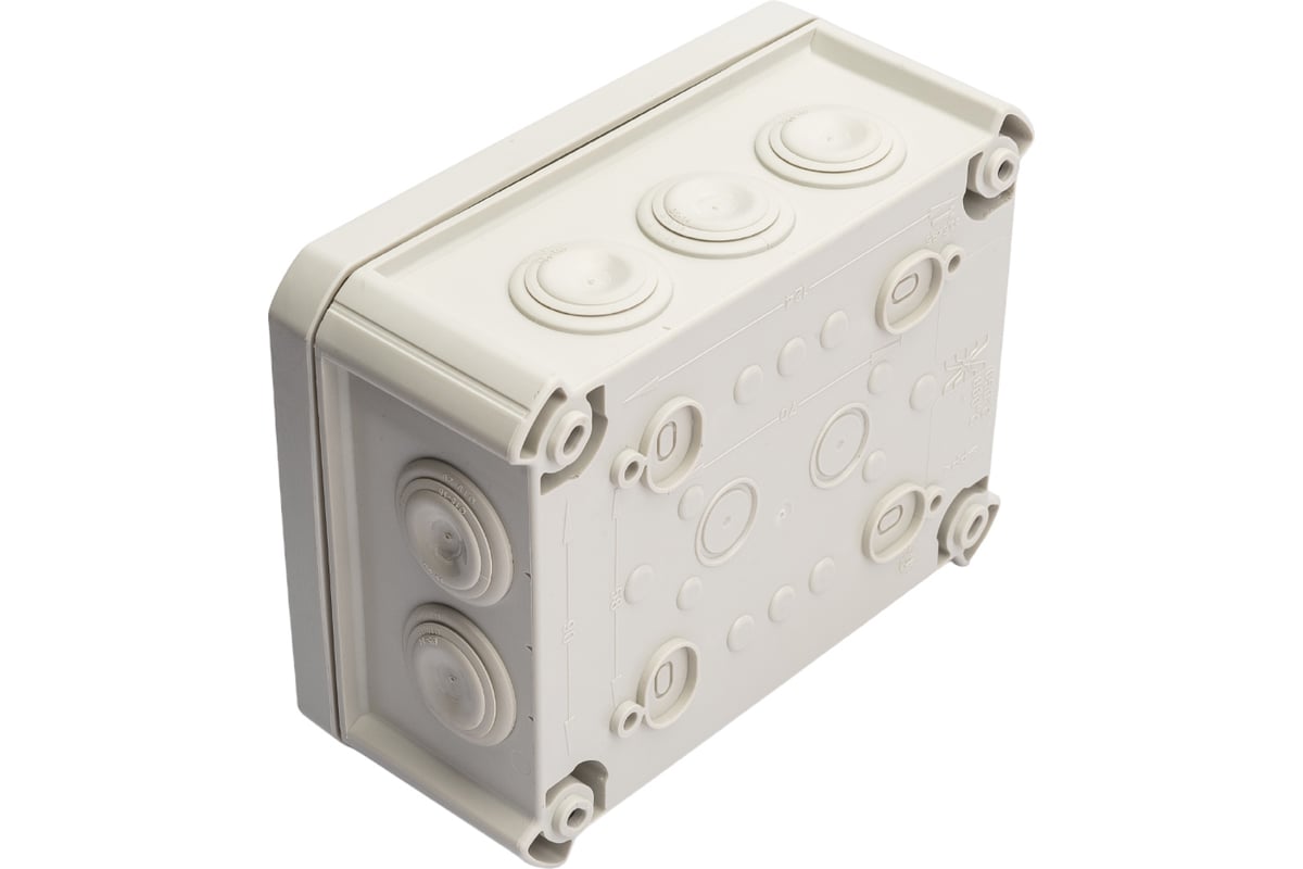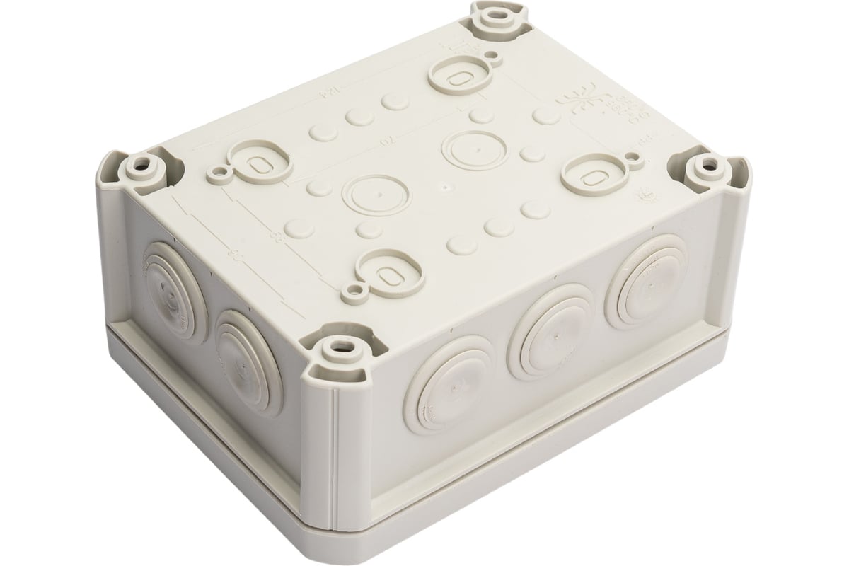 Кабельная распределительная коробка для соединения кабелей и проводов в помещении и в защищенных зонах вне помещения. Прямоугольная форма с вставными уплотнениями по бокам и штамповкой под отверстия на дне. Подходит для настенного и потолочного монтажа и