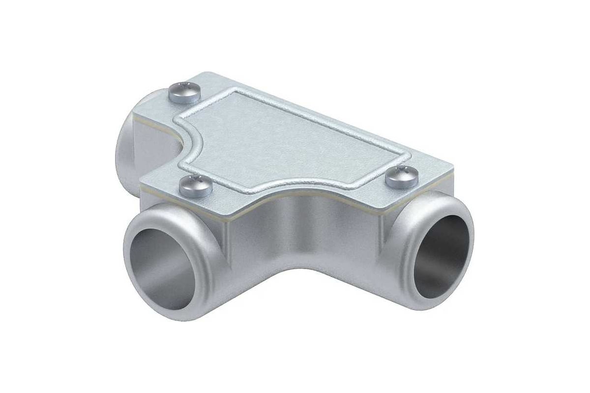 Т-образная секция для соединения труб без резьбы. Со съемной крышкой для проводки и последующего контроля