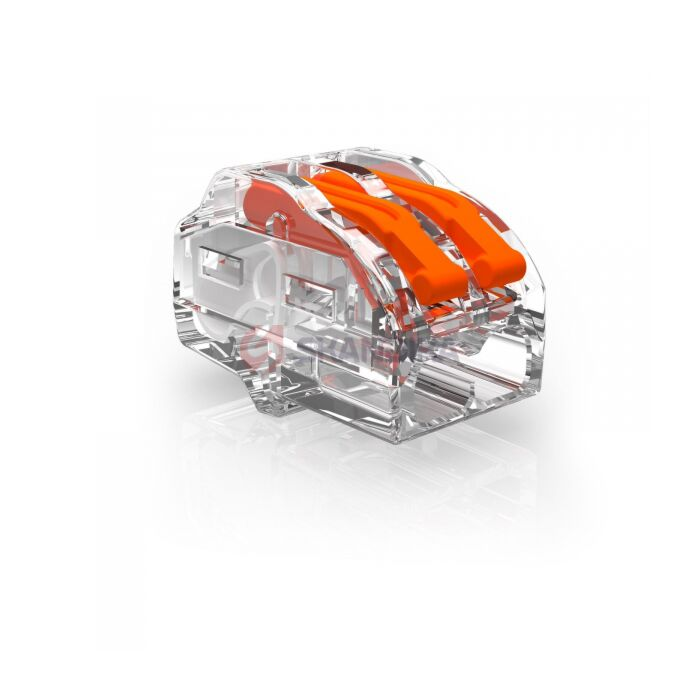 Размерность, мм - 0,2-2,5mm²; Материал - поликарбонат, PC; Цвет - прозрачный (transparent); Универсальная быстрозажимная клемма для соединения электрических проводов, протестированная согласно EN 60998. Провода могут быть гибкими, многожильными или жесткими. При разводке жестких проводов не требуется рычаг. Провод легко устанавливается непосредственно в клемму. Для того чтобы вытащить провод из клеммы, необходимо открыть ее фиксатор. После этого провод легко извлекается. Номинальное сечение: Одно-/многожильные провода 2 x 0,2 - 2,5 мм² Номинальное напряжение: 450 В Номинальный ток: 24 A Длина зачистки провода: 9 мм (+1 мм) Контрольное отверстие: индикатор фазы и тестер (максимальный Ø 2 мм) в верхней части клеммы Максимально допустимая температура окружающей среды согласно EN 60998: 85°C.