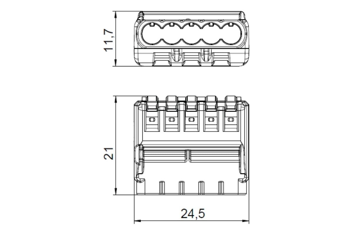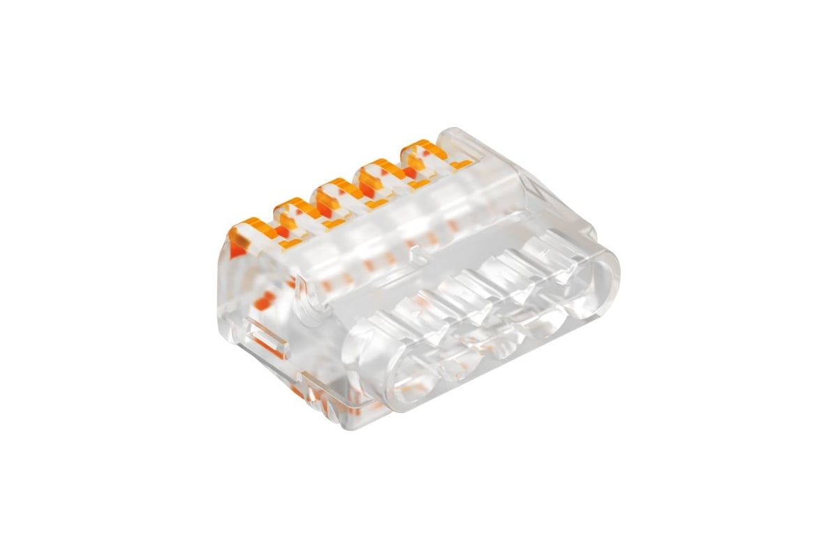 Универсальная быстрозажимная клемма для соединения электрических проводов, протестированная согласно EN 60998. Провода могут быть гибкими, многожильными или жесткими. При разводке жестких проводов не требуется рычаг. Провод легко устанавливается непосредственно в клемму. Для того чтобы вытащить провод из клеммы, необходимо открыть ее фиксатор. После этого провод легко извлекается. Номинальное сечение: Одно-/многожильные провода 5 x 0,2 - 2,5 мм² Номинальное напряжение: 450 В Номинальный ток: 24 A Длина зачистки провода: 9 мм (+1 мм) Контрольное отверстие: индикатор фазы и тестер (максимальный Ø 2 мм) в верхней части клеммы Максимально допустимая температура окружающей среды согласно EN 60998: 85°C.