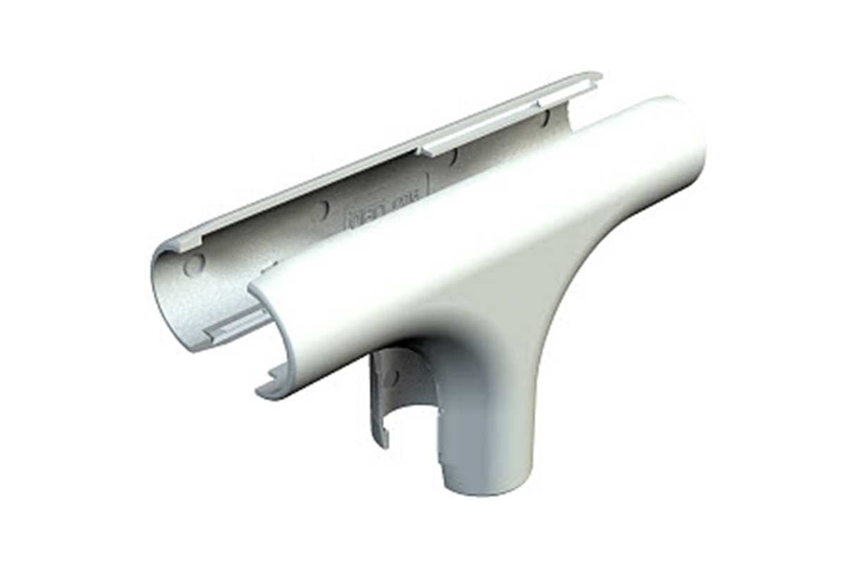 Т-образная секция Quick-Pipe протестирована согласно требованиям VDE и состоит из двух устанавливаемых друг в друга частей, перекрывающих пластиковую трубу Quick-Pipe.