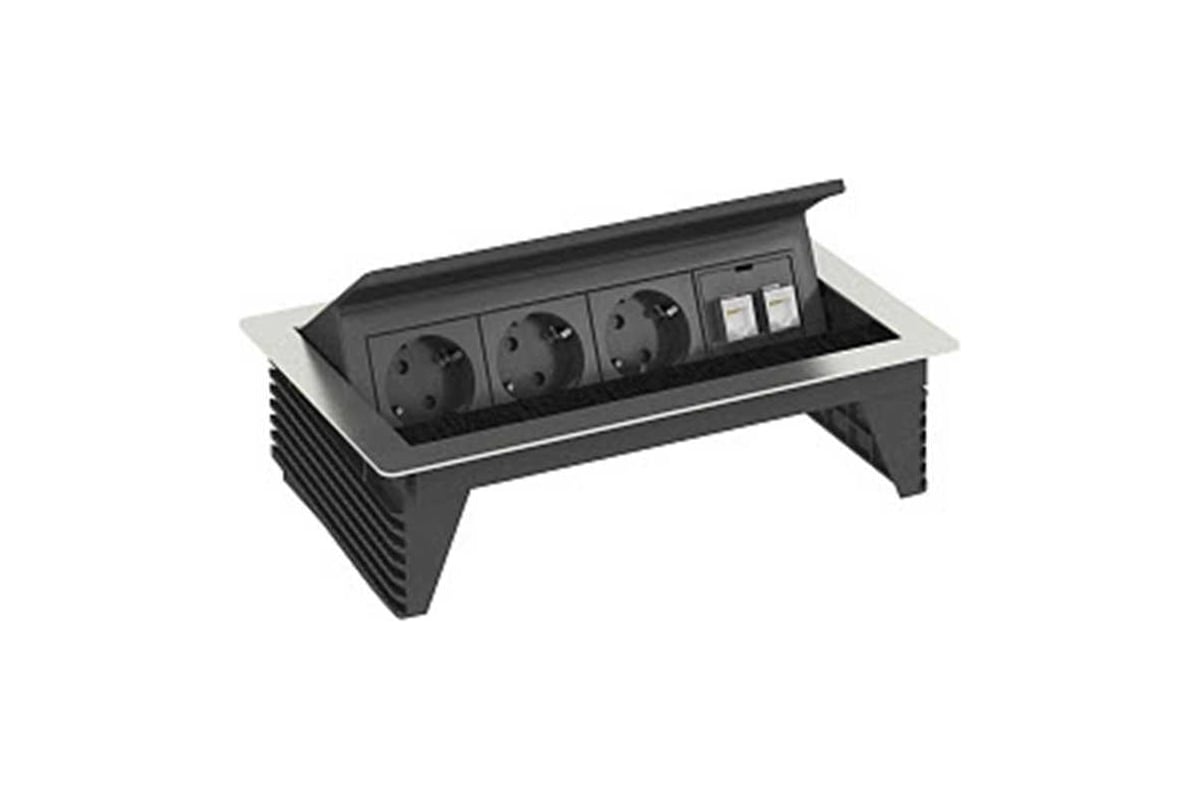 Настольный бокс DBK с крышкой, с силовымкабелем предназначен для фиксированной установки в столешнице, из сатинированной нержавеющей стали, со щеточной планкой для вывода кабеля. Бокс устанавливается в отверстие 245 x 157 мм в столешнице.