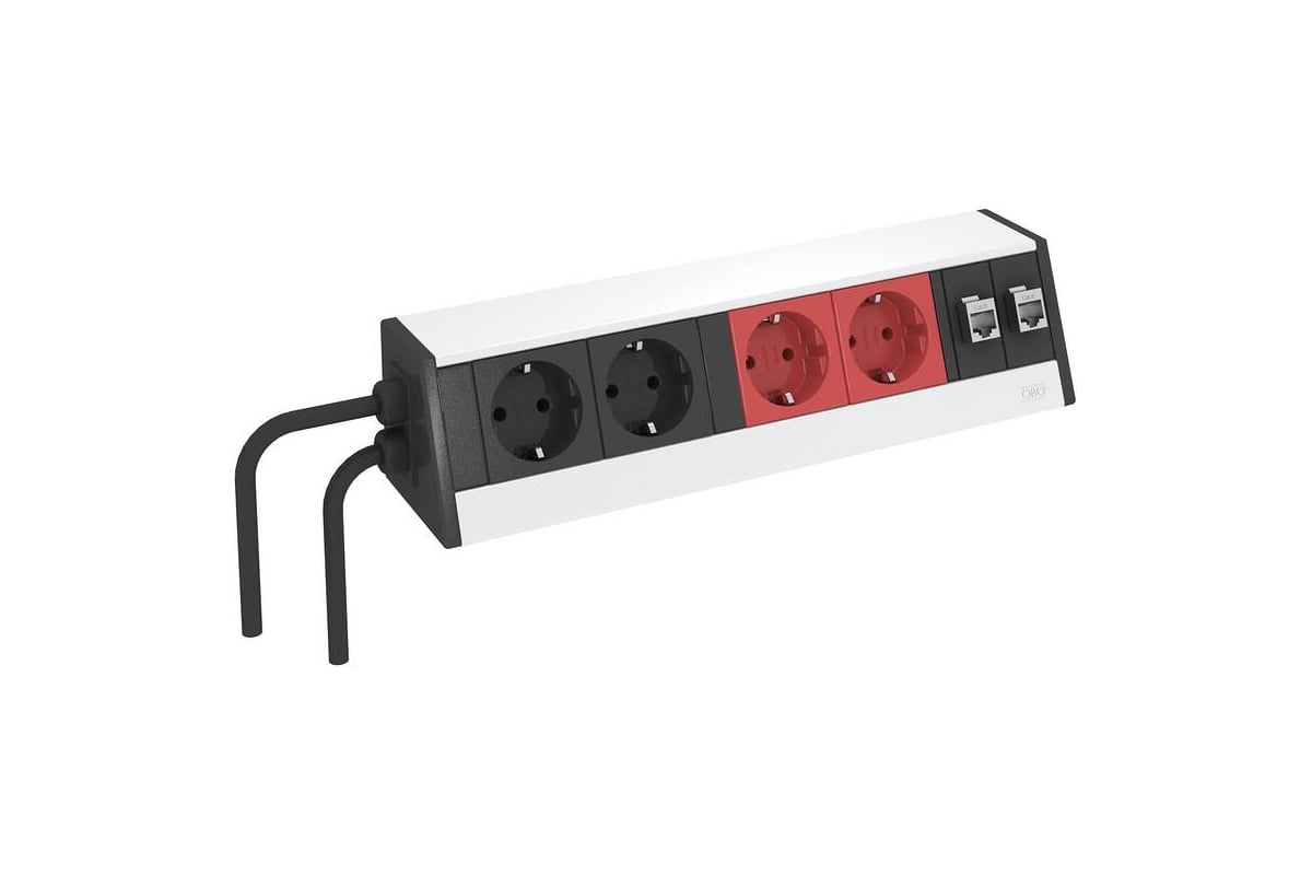 Настольный бокс с соединительным кабелем, вывод для кабеля с левой и правой стороны, фиксируется на столе с помощью противоскользящих опорных точек. Комплектация: - две черные розетки с защитным контактом с углом установки 0°, 3м сетевого кабеля с угловой