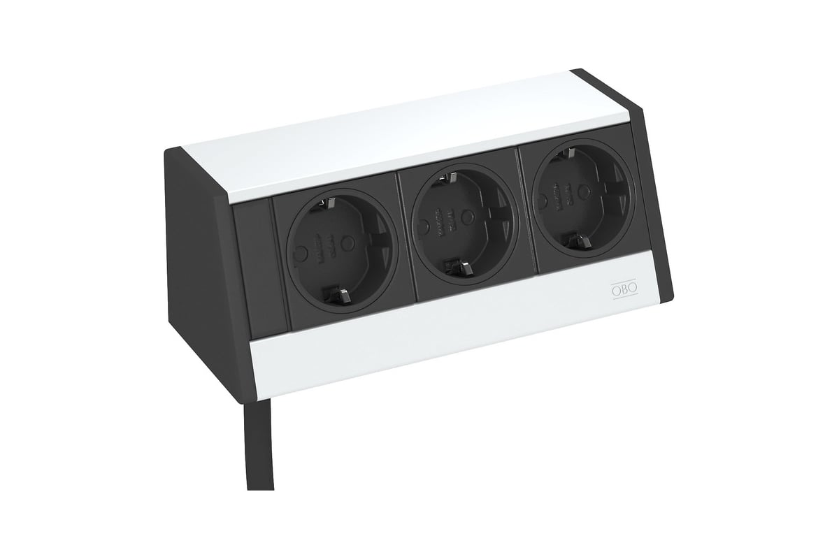 Настольный бокс ссоединительным кабелем, кабельный вывод с нижней стороны, без крепления, комбинируется с любым крепежным материалом серии. Комплектация: - С 3 розетками 0° с защитным контактом, черного цвета, с сетевым кабелем 3,0 мс угловым штекером CEE