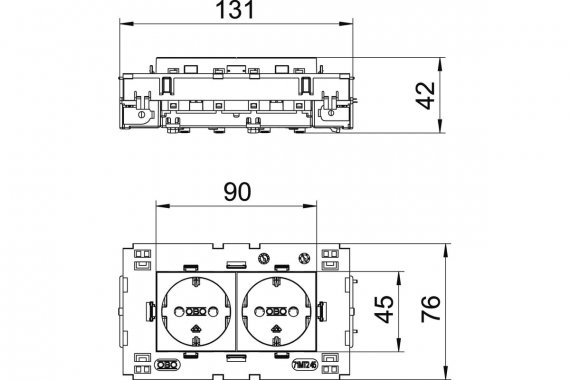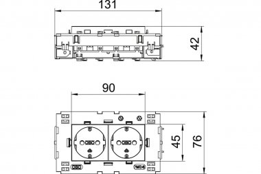 Розетка с заземляющим контактом, двойная 0°, с боковым подключением, с защитными шторками, с автоматическими клеммами, 2-полюсная. Соединительные клеммы соответствуют стандарту IEC 60884-1, подходит для установки в кабельных коробах Rapid 80.
