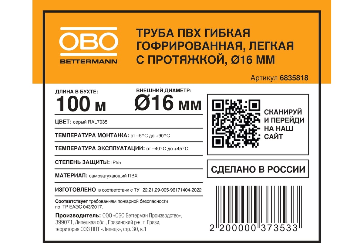 OBO-Bettermann 6835818 Труба гибкая ПВХ гофрированная легкая d16мм L450