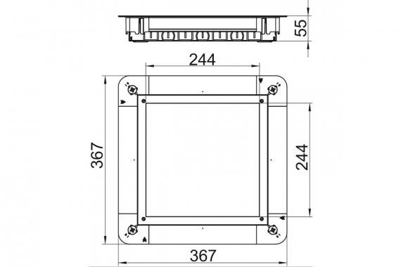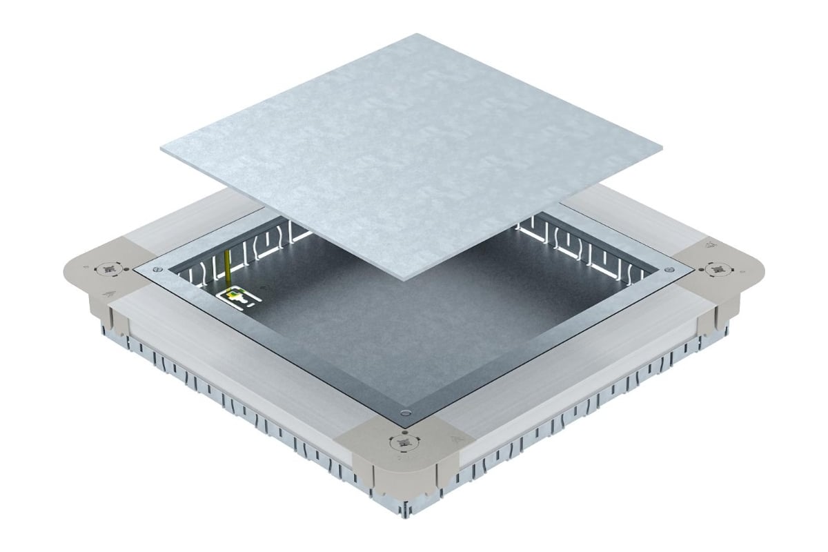 Монтажное основание с заглушкой и крышкой для установки квадратного лючка GES9/55 в стяжке высотой от 55 мм. Верхнюю часть монтажного основания можно плавно выравнивать на номинальной высоте стяжки, верхняя плоскость монтажного основания должна быть запод
